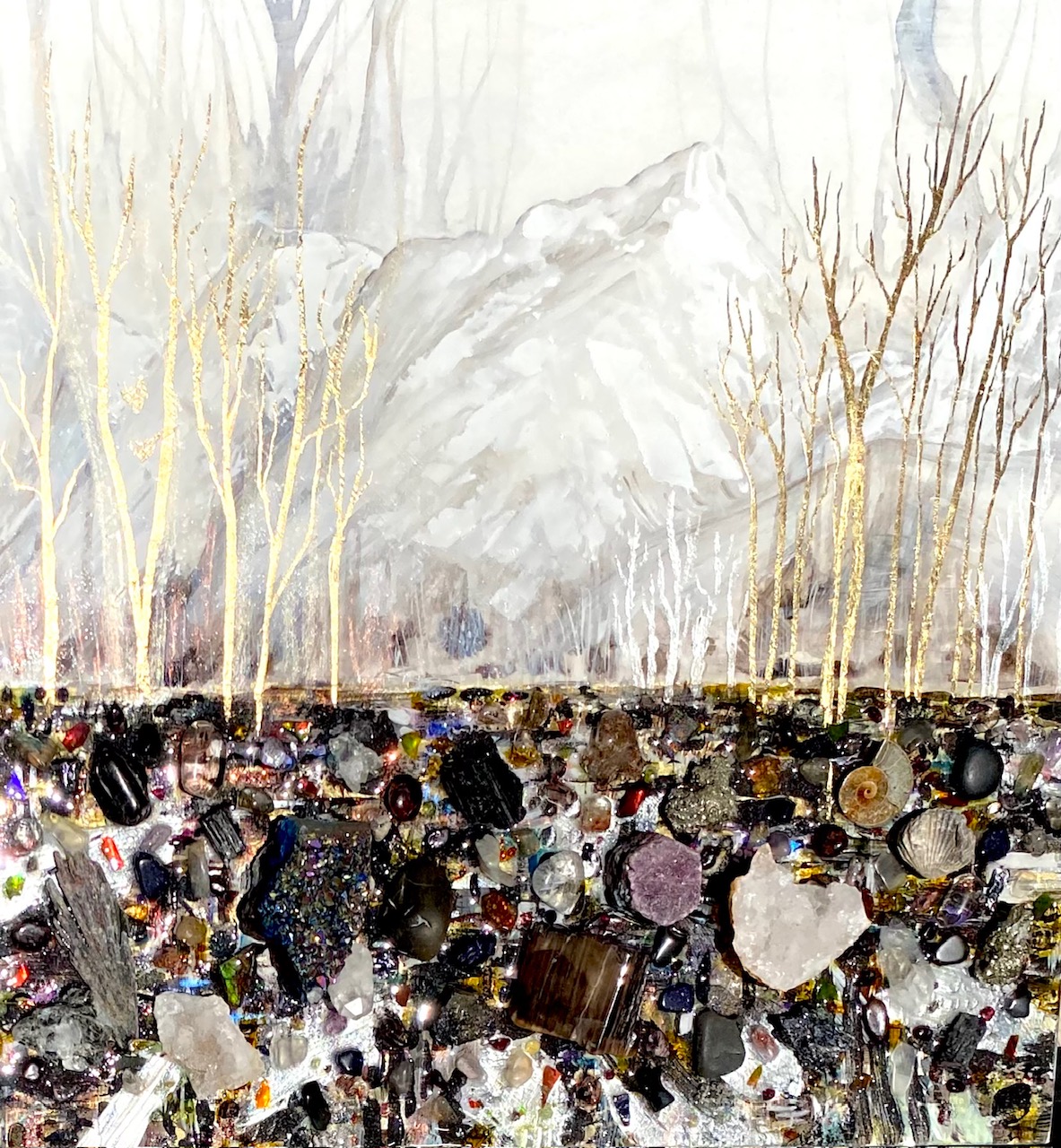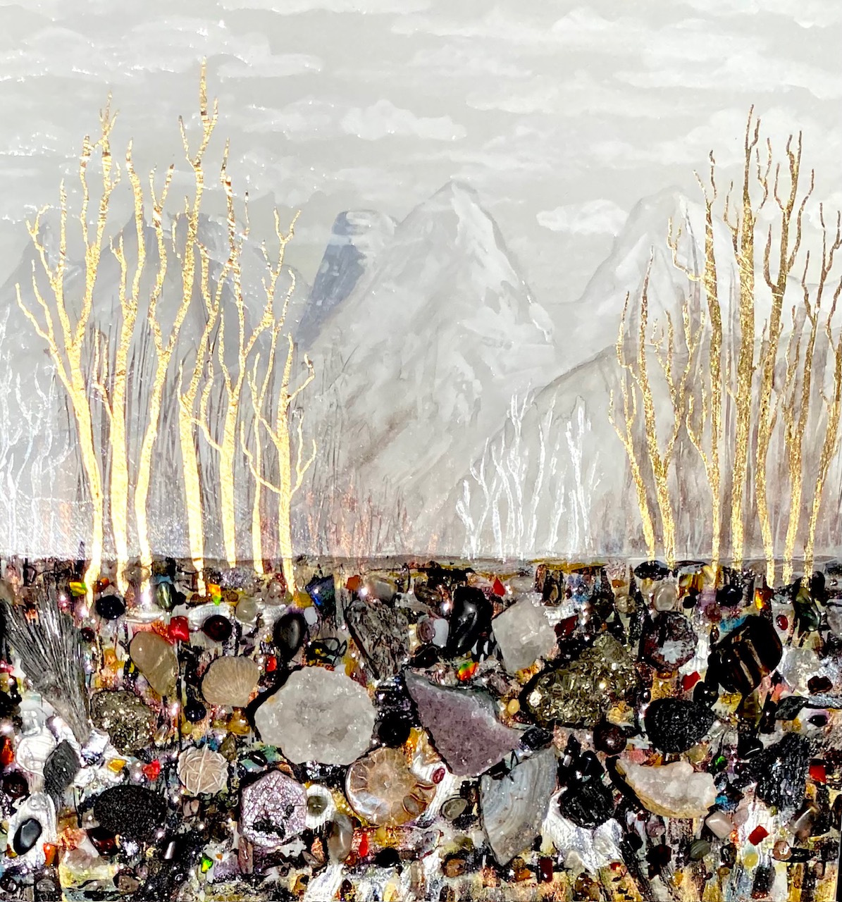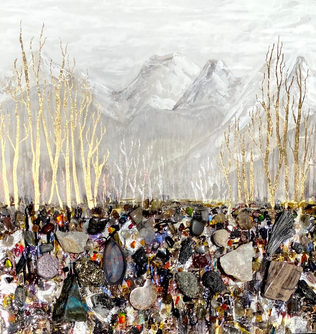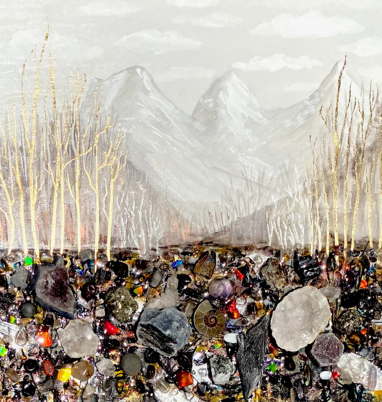 Gemstone painting with geodes, gemstones and rare Alberta ammonite fossils