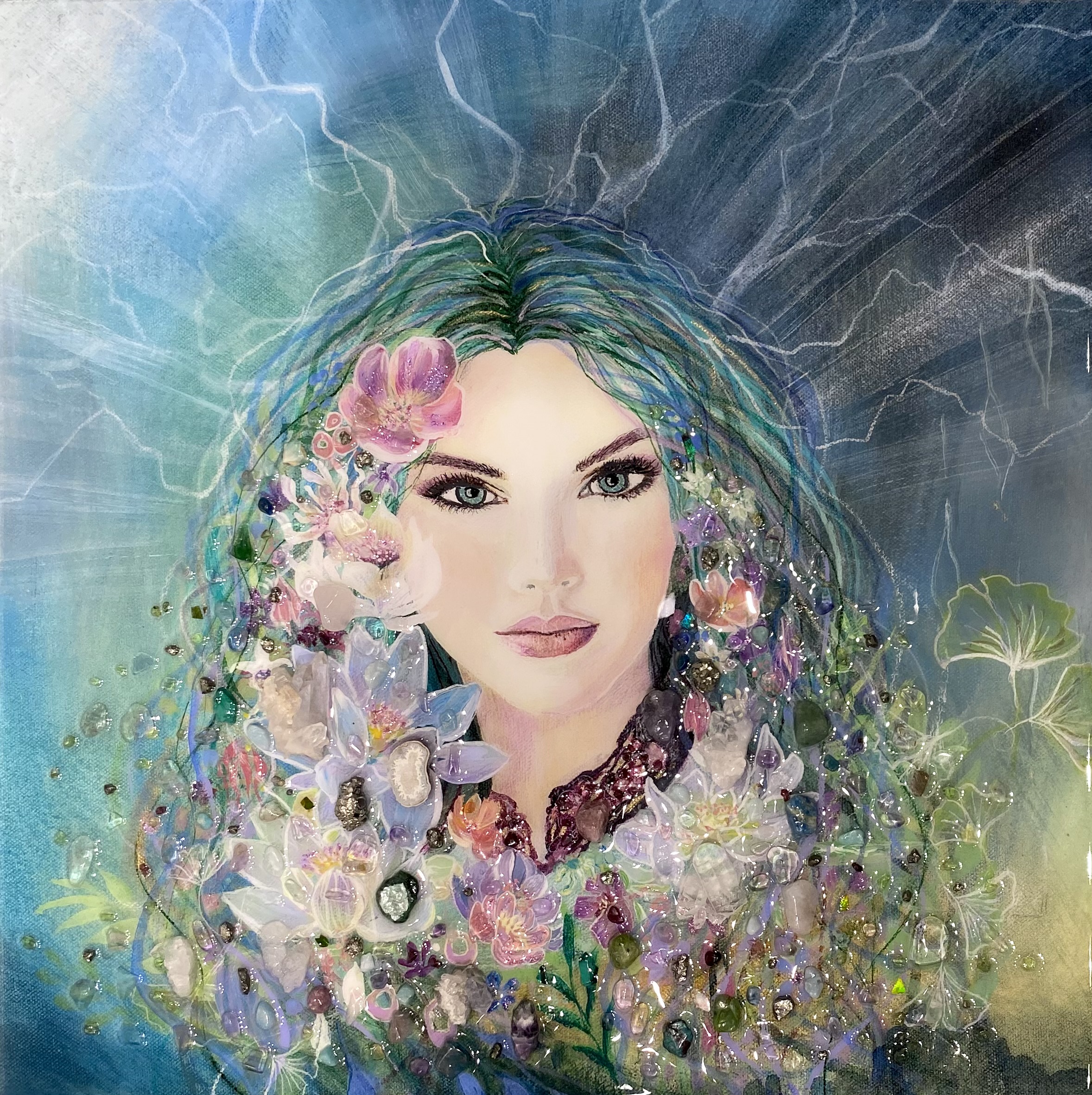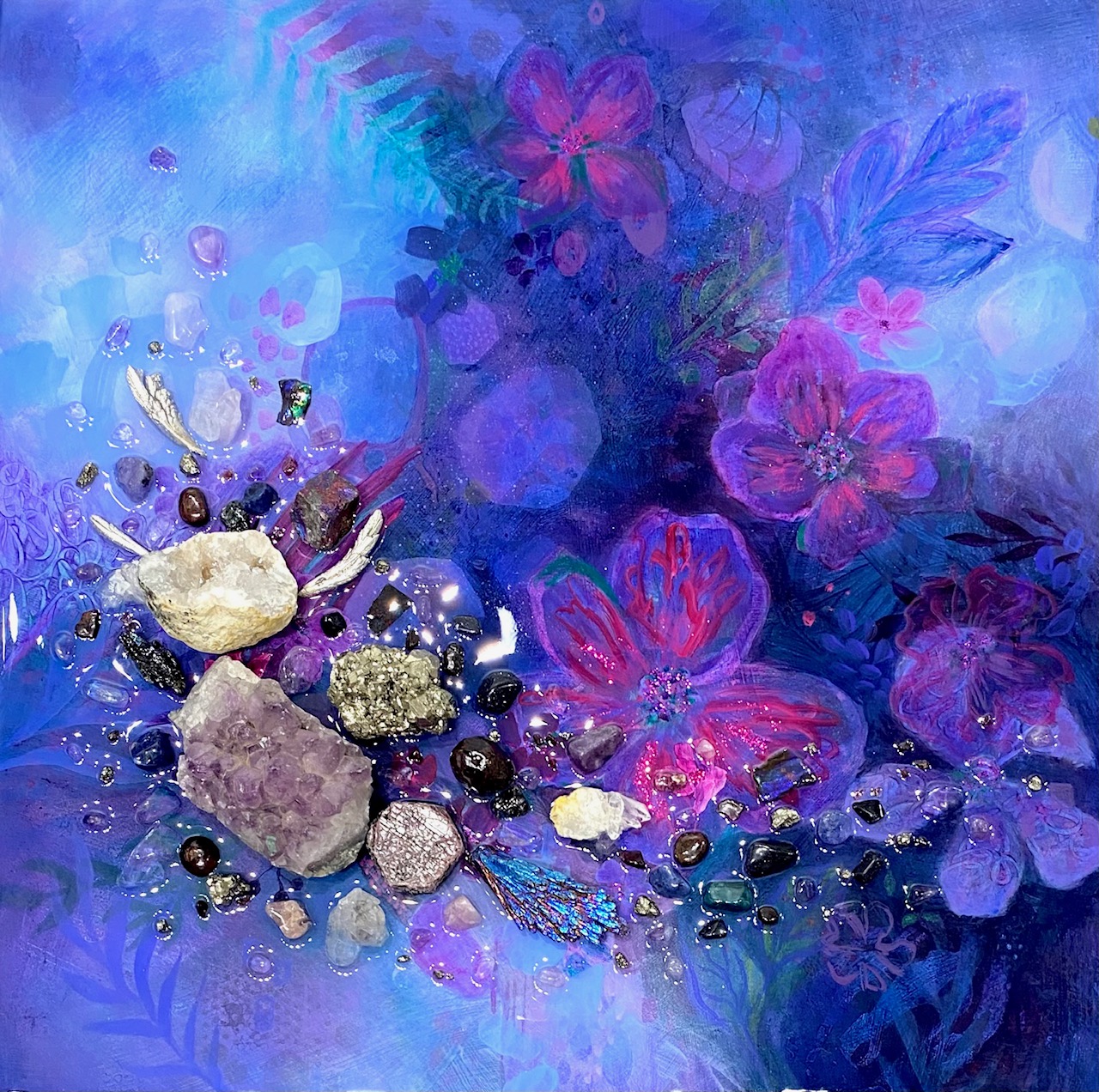 Gemstone painting with geodes, gemstones and rare Alberta ammonite fossils, nature impressionism