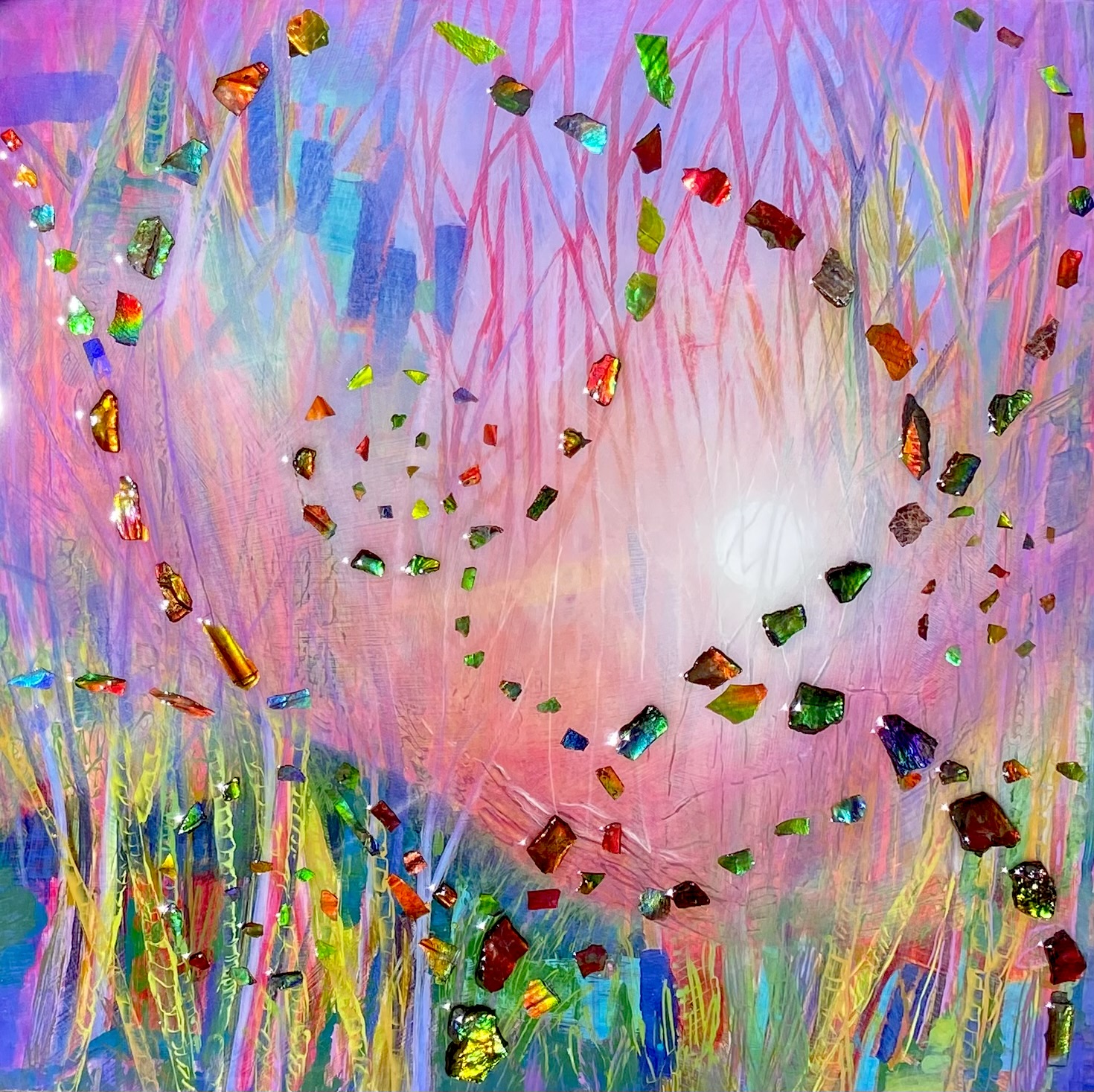 Gemstone painting with rare Alberta ammonite fossils, nature impressionism